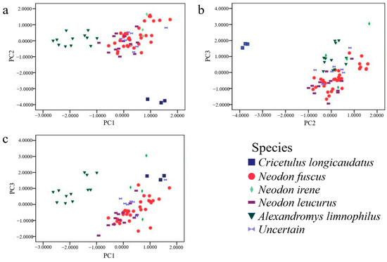 A total of 72 typical rodent specimens with complete external and cranial measurements, including 7 unidentified individuals (Table S4), were used for PCA. The eigenvalues of the first three principal components were ≥1, with 74.3% of the cumulative variance explained, and 14 out of the 20 morphological measurements were significant (absolute loading values ≥ 0.7) (Table S5). Spatial relationships among the 72 rodent specimens were presented using bivariate scatter plots according to their projected values in each of the three principal components. Only C. longicaudatus (Figure 1a,b) and A. limnophilus (Figure 1a,c) could be distinguished clearly from the complex of three Neodon species and unidentified specimens.