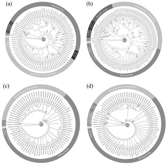 - Galewsk, T.; Tilak, M.; Sanchez, S.; Chevret, P.; Paradis, E.; Douzery, E.J. The evolutionary radiation of Arvicolinae rodents (voles and lemmings): Relative contribution of nuclear and mitochondrial DNA phylogenies. BMC Ecol. Evol. 2006, 6, 80. [Google Scholar] [CrossRef]