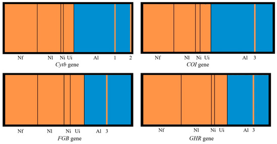 Population structure of rodent specimens in Shiqu based on Cytb, COI, FGB, and GHR genes. The structure analysis of all four genes suggested a significant K value of two for each. Group Orange was mainly composed of Neodon fuscus (Nf), N. leucurus (Nl), N. irene (Ni), and unidentified individuals (Ui). Group Blue was only composed of A. limnophilus (Al) specimens. Three morphologically identified A. limnophilus specimens, HS14140 (1), HS14182 (2), and HS14223 (3), were genetically included in Group Orange.