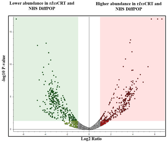 Volcano plot analyses revealed human serum proteins that differentially co-precipitated with rIxsCRT. Normalized abundance values of three biological replicates were used in Proteome Discoverer™ 2.4 software (Thermo Fisher Scientific, Dallas, TX, USA) to generate the volcano plot. In the volcano plot, the Y-axis shows the −log10 p-value and the X-axis shows the magnitude of change (log2 fold change). Red dots represent proteins that co-precipitated in high amounts with rIxsCRT, while green dots represent those that were absent or co-precipitated in low amounts in the presence of rIxsCRT. An adjusted p-value ≤ 0.05 and log2 fold change of more than 2 were used as cut-offs to select proteins that co-precipitated in high amounts with rIxsCRT.