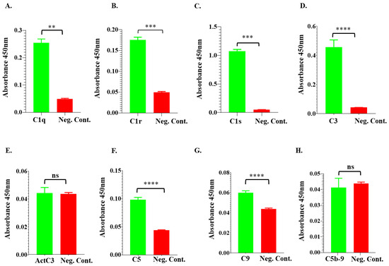 ELISA analysis demonstrates the rIxsCRT binding of complement proteins. High binding ELISA plates coated with affinity-purified rIxsCRT (250 ng) were incubated with normal human serum (NHS) followed by antibodies for C1q (A), C1r (B), C1s (C), C3 (D), activated C3 (E), C5 (F), C9 (G), and C5b-9 or MAC (H) antibodies. Y-axis denotes the absorbance measured at A450nm, which reflected the intensity of the specific antibody binding to rIxsCRT. Non-coated wells blocked with 1% BSA were incubated with NHS and used as a negative control (Neg. Cont.). Data represent mean ± SEM of 3 biological replicates. For statistical analysis, t-test was performed on GraphPad Prism 9 and ** represents p < 0.01, *** represents p < 0.001, **** represents p < 0.0001, and ns represents not significant.