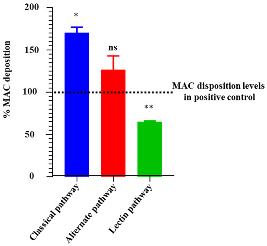The effects of rIxsCRT of complement activation were assayed using the Wieslab® Complement System Screen (Svar Life Science AB, Malmo, Sweden), according to the manufacturer’s recommendation and as previously published [35,37]. This kit evaluates effects on membrane attack complex (MAC) deposition via each of the three complement system activation pathways: classical, lectin, and alternative. To test the effect of the rIxsCRT on the complement pathways, NHS (provided with the kit) was diluted according to the manufacturer’s instructions and incubated at RT for 15 min. Briefly, rIxsCRT (4 μM) was added to the NHS and incubated at 37 °C for 30 min before adding the samples to the wells of the Wieslab® plates. The 100 μL of rIxsCRT and NHS samples (provided in the kit) were then added to the wells of the Wieslab® plates along with a positive control (human serum, provided with the kit); negative controls, provided with the kit; and a blank, (diluent only) in duplicates and incubated at 37 °C for 1 h. Finally, the absorbance was read at 405 nm on a Biotek Synergy H1 microplate reader (Biotek Instrument Inc., Winooski, VT, USA). The MAC deposition rate was calculated as follows: (Sample − NC)/(PC − NC) × 100, where NC is the negative control and PC is the positive control.