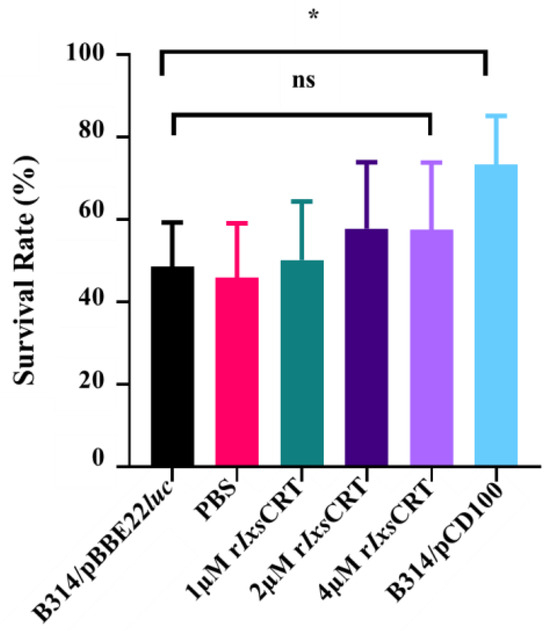 Our preliminary findings showed that rIxsCRT dose-dependently reduced the deposition of the MAC by the mannose-binding lectin pathway, so we were interested in studying its effect on rescuing the complement-sensitive B. burgdorferi spirochete. The complement-sensitive B. burgdorferi (B314/pBBE22Luc) and resistant (B314/pCD100) strains [38] were a kind gift from Jon. T. Skare laboratory (Texas A&M University Health Science Center, College Station, TX, USA). These two strains were genetically modified from the serum-sensitive strain B314, which lacks most linear plasmids, using the shuttle vector pBBE22 [38]. The pBBE22luc expresses luciferase, while the pCD100 expresses luciferase and BBK32, which inhibits the classical pathway of the complement system. Both strains were maintained in BSK-II media supplemented with 6% rabbit serum at 32 °C with 1% CO2 for this assay. A total of 15 µL of normal human serum (NHS) (Complement Technology, Inc., Tyler, TX, USA) was pre-incubated with serial dilutions of rIxsCRT (0.25, 0.5, 0.75, and 1 µM) at 37 °C for 30 min prior to the addition of 85 µL of B. burgdorferi B314/pBBE22luc (106 cells/mL) and inoculated in a bio-shaker at 32 °C with shaking at 100 rpm; PBS (phosphate buffered saline) was used as a blank. NHS with B. burgdorferi B314/pBBE22luc and B314/pPCD100 were included as negative and positive controls, respectively. The survival of spirochetes was assessed at 1.5 h, 2 h, 2.5 h, and 3 h post-incubation. Spirochetes were counted from randomly chosen fields (10–15 fields) under a dark-field microscope. Spirochete viability was arbitrated based on cell mobility, membrane integrity, and cell lysis, as described elsewhere [38]. Spirochete survival rates were calculated from 3 biological replicates. Heat-inactivated NHS (hiNHS) was used as the no-complement-activity control.