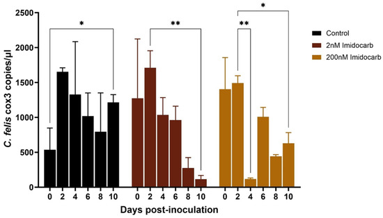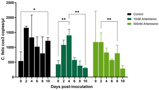 Parasite load in the activated feline macrophages infected with lysed blood from an acutely infected domestic cat with C. felis that were then treated with varying concentrations of artemisinin (10 nM and 500 nM). C. felis replication reduced gradually over time with both treatments. * p < 0.05, ** p < 0.01.