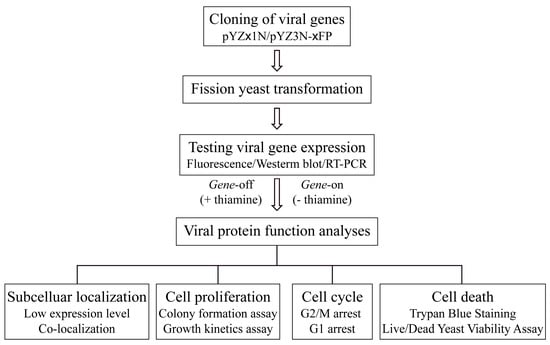In this protocol, we present a streamlined and scalable molecular cloning strategy tailored for genome-wide and comprehensive functional characterization of viral proteins in fission yeast (Figure 1). Specific experimental procedures and examples, from published or unpublished data, are provided for determining subcellular locations of cloned viral proteins and characterizing their effects on basic cellular activities such as cell proliferation, cell cycle regulation, cellular oxidative stress, autophagy, and cell viability. Please note that this protocol is an updated version based on a previously published protocol in a book chapter with newly added information and unpublished data [12]. For further information on using fission yeast to study virus–host interactions involving highly conserved viral proteins, refer to relevant literature reviews [5,9,18,19].
