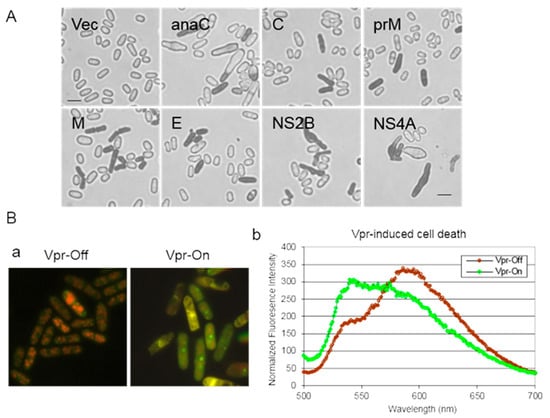 Figure 6. Measurement of cell death in fission yeast using different assays. (A) Cell death induced by various ZIKV viral proteins is assessed 48 h after gene induction through Trypan Blue staining [14]. (B) The Yeast Live/Dead Assay to illustrate HIV-1 Vpr-induced cell death, also measured 48 h after gene induction [27]. (a) Qualitative observation: viable yeast cells (Vpr-Off), which are metabolically active and possess intact plasma membranes, can convert the fluorescent substrate FUN-1 from a diffuse green color to a compact orange–red fluorescent metabolite within cells (left). After 48 h of Vpr induction (Vpr-On), cells fail to convert FUN-1, remaining diffuse green–yellow, indicating cell death (right). (b) Quantitative measurement, where two clearly distinguishable peaks at maximum wavelengths of 590 nm and 540 nm represent live cells and dead cells, respectively. Note that this figure has previously been included in a book chapter [12]. As per our contractual obligations with the publisher, we retain the rights to republish this material, and the relevant copyright information is reproduced verbatim. - Cell viability can also be assessed using a commercial Live/Dead Yeast Viability Assay (Cat. No. L-7009; Invitrogen, Carlsbad, CA, USA), adapted for fission yeast [27,39,43]. This assay measures cell viability by monitoring intracellular metabolic activity through FUN-1 staining. Metabolically active cells convert the yellow-green, fluorescent intracellular FUN-1 into red-orange intra-vacuolar structures, emitting fluorescence at 590 nm. Metabolically inert or dead cells exhibit bright, diffuse, green–yellow fluorescence at ~540 nm (Figure 6B).