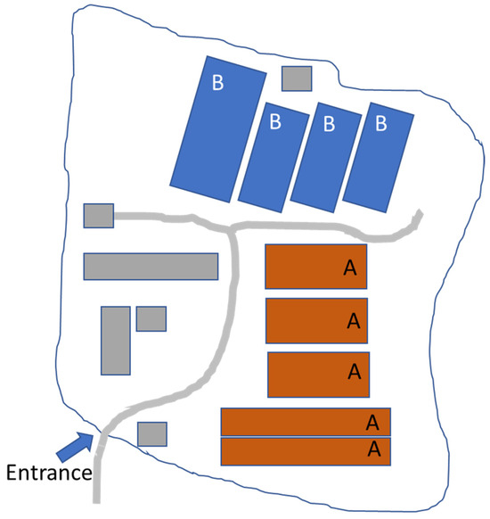 To provide a clearer understanding of the farm’s layout and structure, Figure 1 presents a schematic view of the farm, detailing the placement of each section and stable.