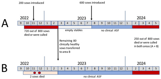 Timeline of ASF infection in both sections (A,B) of the sow farm. Red bars indicate clinical infections while blue bars indicate no clinic in pigs.