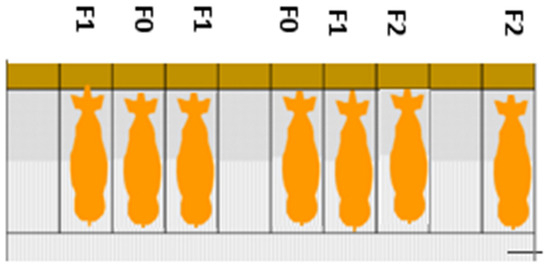 Housing of sows on an ASF-infected farm: F0—sows with signs of infection; F1—sows in direct contact with F0; F2—sows in direct contact with F1 or in the same row as F1.