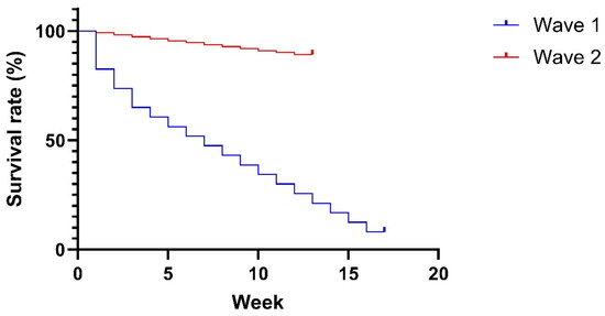Kaplan–Meier survival curve comparing the survival rates of the two African swine fever waves on a sow farm in Vietnam.