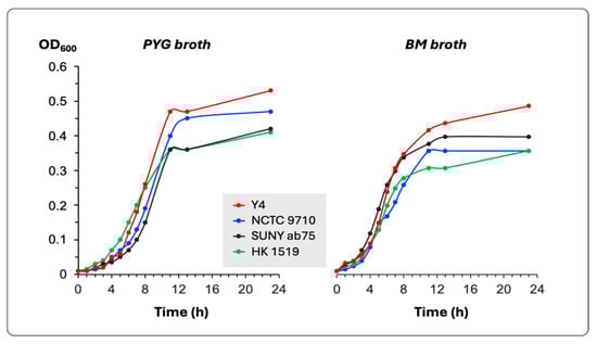 Growth curves in PYG and BM broths of the four bacterial strains. The growth was determined by the change in the optical density of the culture at 600 nm (OD600).