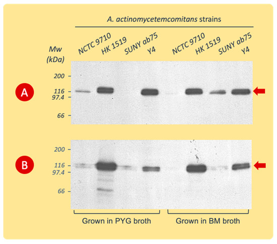 Cell surface-associated LtxA extracted from A. actinomycetemcomitans strains cultured in PYG or BM broth. The cells were harvested during the logarithmic (A) or stationary (B) phases of growth. The leukotoxin appears as a protein band at the 116 kDa position (arrow) in SDS-PAGE (8%). Data from representative experiments are shown.