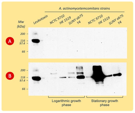 The immunoblotting of gels with the SDS-PAGE separated extracts showed a high specificity of the polyclonal leukotoxin antiserum for the 116 kDa protein band (Figure 3). The amino acid sequence analyses of this protein band showed a complete sequence homology with A. actinomycetemcomitans LtxA, (accession number P16462, https://www.uniprot.org/uniprotkb/P16462/entry, accessed on 7 January 2015).