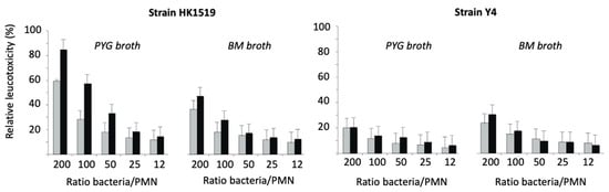 Relative leukotoxicity of A. actinomycetemcomitans HK1519 and Y4 grown in PYG or BM broth and harvested during the logarithmic (grey bars) or stationary (black bars) phases of growth. The leukotoxic activity was examined at various ratios of bacteria/PMN.