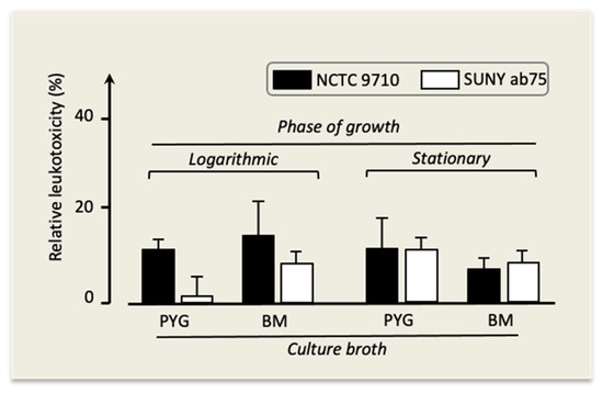 In all experiments, the leukotoxicity of strains NCTC 9710 and Suny ab75 was somewhat lower compared to the one of strain Y4, and it reached detectable levels under the conditions displayed in Figure 6.