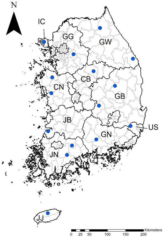 Ticks were collected from 15 locations between April and November 2022: (1) in the metropolitan areas of Incheon (Ganghwa-gun) and Ulsan (Ulju-gun) and (2) in the provinces of Gyeonggi (Gwangju-si), Gangwon (Inje-gun, Samcheok-si), Chungcheong-buk (Chungju-si), Chungcheong-nam (Dangjin-si, Boryeong-si), Gyeongsang-buk (Andong-si, Gimcheon-si), Gyeongsang-nam (Jinju-si), Jeolla-buk (Gochang-gun), Jeolla-nam (Gokseong-gun, Boseong-gun), Jeju (Jeju-si) across the ROK (Figure 1). The ticks were collected using dry ice bait-collecting traps (Shin-Young Commerce System, Gyeonggi, Republic of Korea) and preserved in 70% ethanol. Subsequently, tick identification was performed via morphological analysis at the species level and developmental stage using a pictorial key [22].
