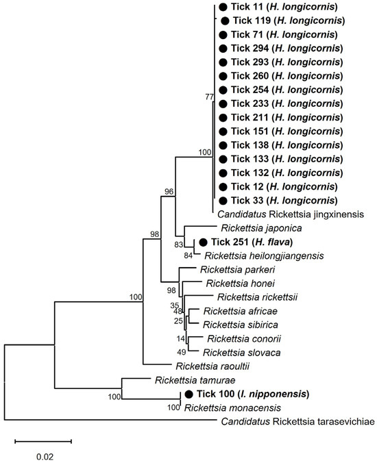 The results of the phylogenetic analysis based on 17 kDa, ompA, and gltA concatenated sequences are illustrated in Figure 3. The following representative sequences were selected for phylogenetic analysis without duplicate sequences: 17 kDa (nine sequences, PP116492–500), ompA (11 sequences, PP116501–511), and gltA (three sequences, PP116512–514). They shared 100% identity with the 17 kDa sequence previously reported for R. monacensis (LC379454.1), R. heilongjiangensis (CP112971.1), and Candidatus R. jingxinensis (MH932031.1) (Table S2). In addition, sequences obtained from ompA and gltA genes shared 99.6–99.8% and 99.2–100% identity with those previously reported for R. monacensis (MK613926.1 and MN630884.1), R. heilongjiangensis (MG906665.1 and MG906669.1), and Candidatus R. jingxinensis (MH932061.1 and MW114883.1) (Table S2).