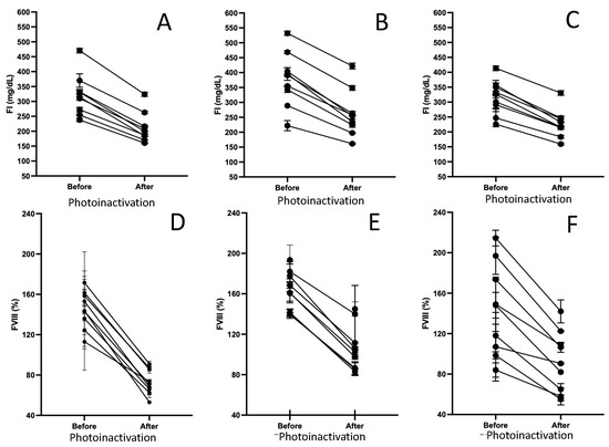 Graphical representation of the behavior of the FVIII and FI factors before and after bacterial photoinactivation (classified by bacterial strain tested). (A,D) E. cloacea 087, (B,E) Klebsiella ozaenae 008, and (C,F) Staphylococcus epidermidis 6(01).