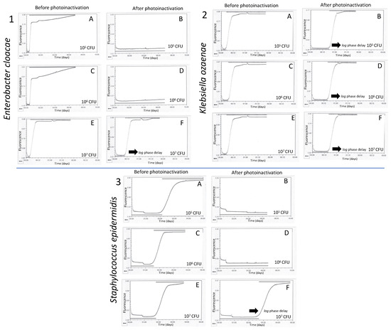 Bacterial growth curves before and after photoinactivation assays in plasma bags. 1(A–F) Enterobacter cloacae 087, 2(A–F) Klebsiella ozaenae 008, and 3(A–F) Staphylococcus epidermidis 6(01).