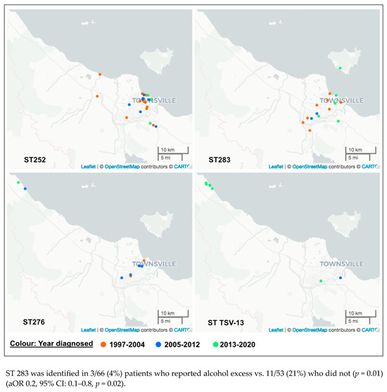 Geographic population analysis demonstrated no association between a suburb location and age, sex, or First Nations status. With regard to genomic factors, there were associations with location. Novel sequence type isolates were most likely to be found outside inner city suburbs, even when adjusting for age and FNs status (aOR: 4.0, 95% CI: 1.7–9.0, p = 0.001). In contrast, the LPS A genotype was least likely to occur in the outer city region (−18°22” and −19°38S to 145°93 and 146°93”E) (aOR 0.2, 95% CI: 0.1–0.8, p = 0.01). The novel sequence type TSV-13 was also associated with this outer city region (p = 0.007) (Figure 3). This particular region of interest includes a higher proportion of elderly residents. The average number of residents between 60 and 79 years of age is twice the state and national average. All patients infected with this ST were over 50 years of age. Three of seven (43%) were 50–69, and 4/7 (57%) were older than 70 years (p = 0.05).