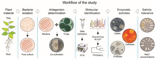 To determine the antifungal activity of bacteria associated with plants grown in an area of the Aral Sea capable of inhibiting phytopathogenic fungi, including their enzymatic activities and salt tolerance ability, we developed an exploratory workflow for the stepwise identification of bacterial isolates, as illustrated in Figure 1.