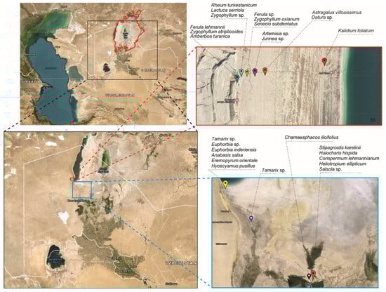 Maps of the Aral sea and of sample collecting sites. The red bold line on the map depicts the lake’s initial boundary in 196-, before it shrank. The dashed red line represents the location of samples from the western Aral Sea, while the blue dashed line represents sample collection from the lake’s central and southern seabeds. Black dashed lines indicate the names of collected plant species.