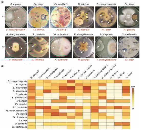 Antifungal activity of bacterial isolates against phytopathogenic fungi. (a) Examples of the antifungal abilities of different antagonistic bacteria. The name in red indicates phytopathogenic fungi. (b) Heatmap depicting the antifungal activities of antagonistic bacterial species. The zero-to-one-hundred scale shows the percentage of bacterial antifungal ability.