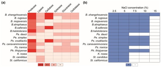 Enzymatic activities of the antagonistic bacteria and their salt tolerance ability. (a) Protease, lipase, cellulose, xylanase, glucanase, and cellobiase activities of antagonistic bacteria. ‘+’, ‘++’, and ‘+++’ represent different levels of activity, and ‘−’ indicates an absence of enzymatic activity. (b) Salt tolerance of antagonistic bacteria in various concentrations. ‘+’ and ‘−’ represent the presence or lack of bacterial salt tolerance, respectively.