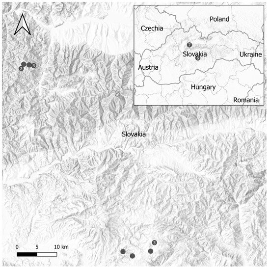 Tick collection sites were situated in two different mountain ranges in the Western Carpathians, the Poľana Mountain (Mt.) and the Smrekovica Mt. The Poľana Mt. is the highest volcanic mountain range in Slovakia, with the peak altitude of 1458 m above sea level (a.s.l.). Due to its exceptional natural and landscape value, it was designated as a UNESCO Biosphere Reserve, with agricultural and forestry activities restrictions. The forest is mainly composed of European beech (Fagus sylvatica L.), along with silver fir (Abies alba Mill.) and sycamore (Acer pseudoplatanus L.). Other tree species such as ash (Fraxinus excelsior L.), Norway spruce (Picea abies (L.) H. Karst.), and wych elm (Ulmus glabra Huds.) are present less frequently. Adjacent forests are dominated mostly by European beech or Norway spruce [16].