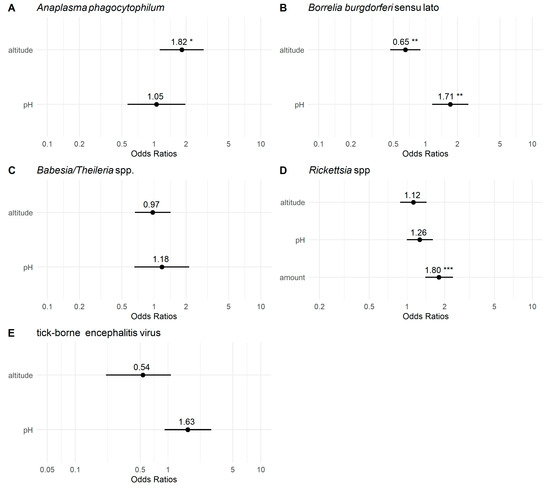 In the case of Rickettsia spp., neither altitude nor soil pH significantly affected the occurrence of the pathogen. However, the ‘amount’ was a significant predictor, associated with a higher probability of detecting the pathogen in the sample. Notably, the Rickettsia spp. model was the sole model where including the ‘amount’ factor improved the AIC. In the examination of TBEV detection, neither altitude nor soil pH demonstrated a statistically significant effect. The McFadden pseudo-R-squared values indicated that the Rickettsia and TBEV models captured only a small proportion of the variance in their dependent variables.