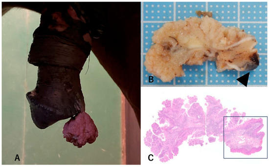 Penile mass in a 22-year-old Thoroughbred stallion. (A) Mass before extraction. (B) Slit surface of the formalin-fixed mass. The resection area is indicated by arrows. (C) Loupe view of the mass. Epidermal hyperplasia was observed in the stalk (indicated by a square) and papillomas in the head. Hematoxylin and eosin (HE) staining.