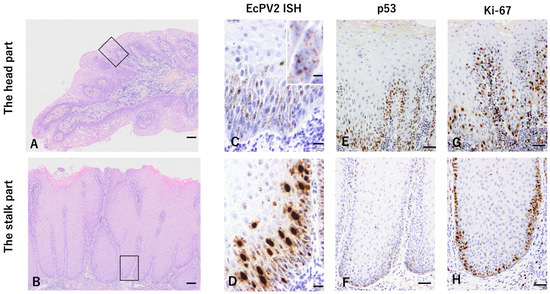 Photomicrographs of Equus caballus papillomavirus type 2 (EcPV2)-associated penile mass. Findings pertaining to the head of the mass are shown in the top row, and findings pertaining to the stalk of the mass are in the bottom row. (A) Proliferated epidermal cells were observed in a papillary fashion supported by a fibrovascular stroma. The area shown in (C,E,G) is indicated with a square. Hematoxylin and eosin (HE) staining was conducted. Bar, 100 μm. (B) The epidermis prominently thickened with orderly maturation and formed broad rate pegs. The area shown in (D,F,H) is indicated with a square. HE staining. Bar 100 μm. (C) Basal and spinous cells located in the middle or deep epidermis with the scattered fine-granular signal. In situ hybridization (ISH) was performed. Bar, 20 μm. The inset shows the cell with the scattered fine-granular signal. ISH. Bar, 5 μm. (D) Spinous cells had strong diffuse nuclear signals. ISH. Bar, 20 μm. (E) Some deep epidermal cells and basal cells were positive. Immunohistochemistry. p53. Bar, 50 μm. (F) Fewer basal cells were positive. Immunohistochemistry. p53. Bar, 50 μm. (G) Some deep epidermal cells and basal cells were positive. Immunohistochemistry. Ki-67. Bar, 50 μm. (H) Basal cells were positive. Immunohistochemistry. Ki-67. Bar, 50 μm.