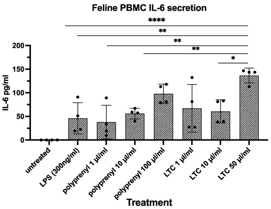 IL-6 secretion by feline PBMCs: polyprenyl vs. LTC. Statistical differences were obtained using a one-way ANOVA with Tukey’s multiple comparisons test with ****, p ≤ 0.001; **, p ≤ 0.01; and *, p ≤ 0.05.