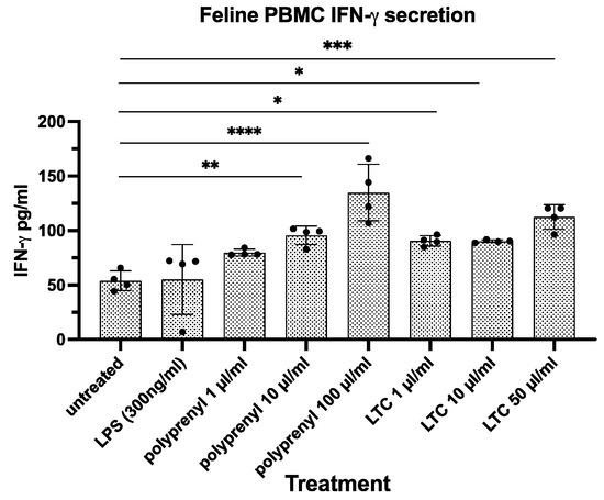 IFN-γ secretion by feline PBMCs: polyprenyl vs. LTC. Statistical differences were obtained using a one-way ANOVA with Tukey’s multiple comparisons test with ****, p ≤ 0.001; ***, p ≤ 0.005; **, p ≤ 0.01; and *, p ≤ 0.05.