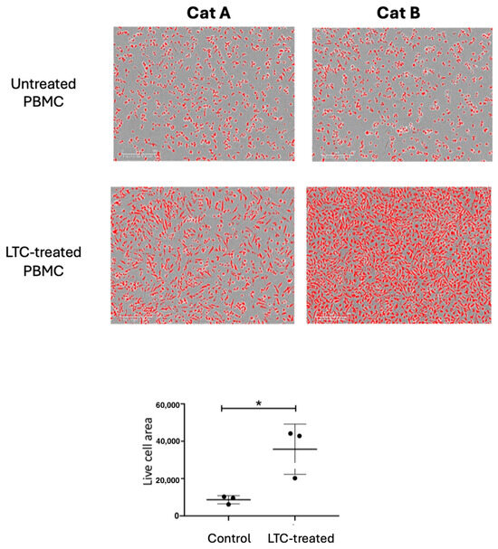 LTC activation of feline leukocytes prevents cytopathic effects imposed by FIPV. Untreated cells (A), or cells treated with LTC overnight (B) were inoculated with virulent FIPVs to assess cytopathic effects and cell survival (live cells appear as red dots in these images). Cell survival data are summarized in C, illustrating significant protection from FIPV-induced killing by factors from LTC-activated leukocytes. Significance defined as * p ≤ 0.05 using non-parametric Mann–Whitney t-test.