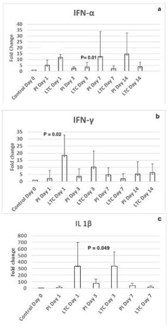 Fold change increases in IFN-α (a), IFN-γ (b), and IL-1β (c) mRNA at Days 1, 3, 7, and 14 in cats administered the LTC or PI protocols. When results were significantly different between groups on individual days, the p value is posted above the values.