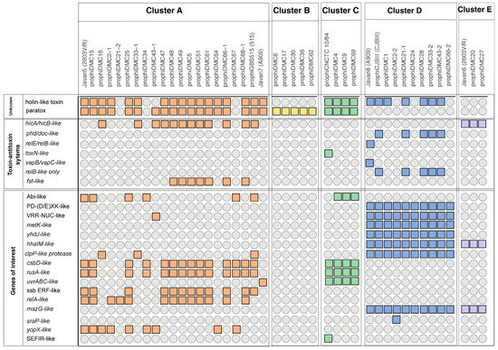 Identified genes that may contribute to bacterial fitness. Genes of interest are widely dispersed among clusters. Co-occurrence of the paratox and holtox proteins is diverse and not cluster dependent. Solid colored boxes represent the presence of genes of interest by prophage cluster; orange-cluster A, yellow-cluster B, green-cluster C, blue-cluster D, purple-cluster E. The absence of a gene is indicated by a grey circle.
