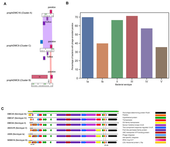 Paratox is encoded from both the prophage genome and the bacterial chromosome. (A). Phamerator map alignment of prx gene from selected prophages within each cluster (A–C). (B,C). Alignment of genome region of prx genes found on the host chromosome. The color panel above the selected sequences indicates high-to-low sequence conservation. Grey blocks indicate homologous sequences. Genes are marked by arrows, for which the putative functions are indicated by the colored key. Dotted box indicates prx gene.