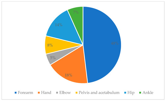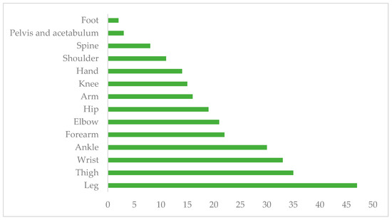 Of the total number of patients, 19 (6.8%) presented with an infection associated with the placement of an orthopedic implant. The male population was more affected than the female population, with a statistical significance of p = 0.0035 (Table 2). It is worth mentioning that no significance was found between the frequency of infections and age, comorbidities, or nutritional status. In total, 63.2% of the population had some comorbidity. The main comorbidities identified within the group of infected patients were systemic arterial hypertension (5.2%), diabetes mellitus (15.7%), and overweight and obesity (47.3%). At the same time, the highest frequency of infection occurred in the legs (32%), thighs (21%), and hands (16%) (Figure 3).