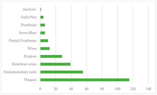 The orthopedic implants were made of stainless steel (97.2%), titanium (2.1%), and ceramic (0.7%). As for the anatomical regions of the implants, the most frequent were the legs, followed by the thighs, wrists, and ankles (Figure 1). Regarding the type of implant, the most frequently used were plaques (41.7%), endomedullary nails (20%), Kirschner wires (14.1%), fixators (10.1%), wire (3.6%), partial prostheses (3.6%), screws/bars (2.2%), total prostheses (2.2%), screws (1.4), and anchors (0.4%) (Figure 2).