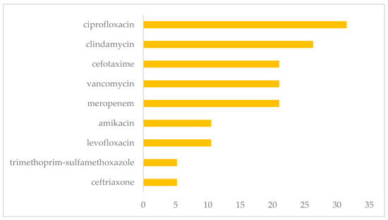 Antibiotic treatment was established based on the susceptibility results. Thus, the main antimicrobials used were ciprofloxacin (31.5%), to treat infections caused by all identified etiologic agents (S. aureus, E. coli, S. epidermidis, K. pneumonia, P. aeruginosa, E. faecalis, E. chloracae, P. putida), followed by clindamycin (26.3%), for the treatment of infections caused by S. aereus, S. epidermidis, and K. pneumoniae, and cefotaxime (21.05%) for S. aereus and S. epidermidis. Additionally, the administration of vancomycin was considered; however, cases of resistance in S. epidermidis were identified (Figure 5).