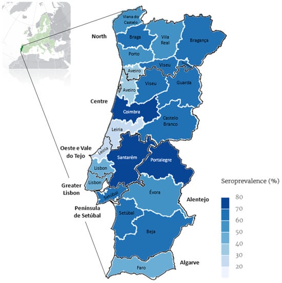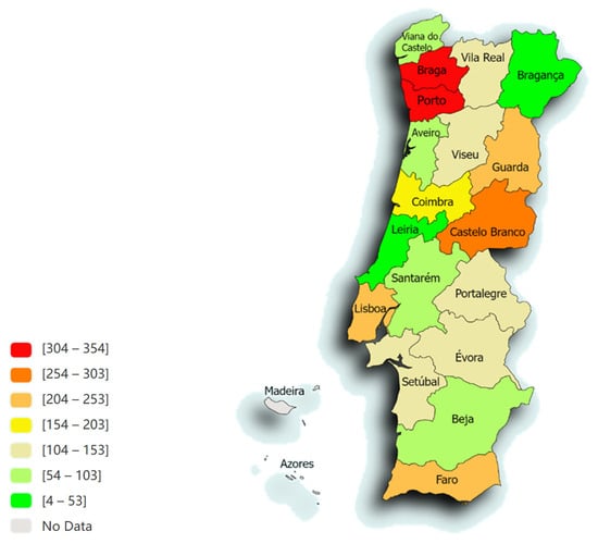 The spatial distribution, according to the distribution of animals from the different districts of Portugal, of the 2801 animals admitted to the LEISCAN® Leishmania ELISA Test (map drawn in paintmaps.com; accessed on 10 June 2024).
