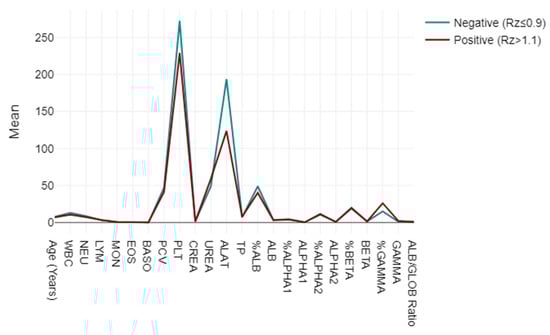 A mixed-model ANOVA was utilised to evaluate blood and biochemical markers, categorising them based on their responses to the LEISCAN® Leishmania ELISA Test as either negative (Rz ≤ 0.9) or positive (Rz > 1.1). The analysis highlighted strong associations in the key parameters, including lower WBC, NEU, PCV and PLT levels in positive cases, alongside elevated UREA and GAMMA globulin levels, suggesting impactful physiopathological correlations. The ALB/GLOB ratio also varied, indicating potential diagnostic utility (p < 0.001) (Figure 3).