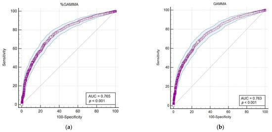 The area under the curve–receiver operating characteristic (AUC-ROC) of parameters that showed the highest correlation and statistical significance (p < 0.001) with the LEISCAN® Leishmania ELISA Test. (a) The AUC-ROC of %GAMMA; (b) the AUC-ROC of GAMMA (g/dL); (c) the AUC-ROC of %ALB; (d) the AUC-ROC of the ALB/GLOB ratio (g/dL); (e) the AUC-ROC of the ALB/GAMMA ratio (g/dL).