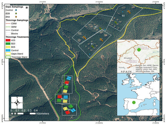 Location and design of experimental area *. Silvicultural treatments (thinning or gap); thinning intensity: strong selective thinning (35% basal area; A35), strong low thinning (35% basal area; B35), and moderate low thinning (20% basal area; B20). Thinning plots with (CMM) or without (SMM) coarse woody debris; gap diameters of 26 m (Ø26) or 44 m (Ø44); gap soil sampling position in High, Center, or Low area. Using ArcMap 10.8.1©, GPSMAP® 66i, and digital cartography by the National Geographic Institute of Spain. https://www.scne.es/ (accessed on 20 April 2024).