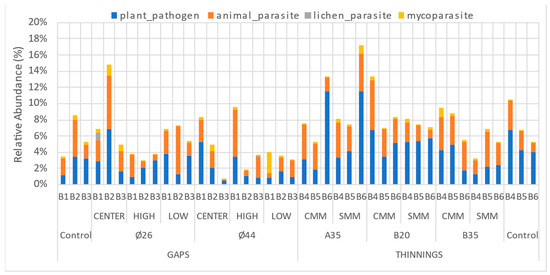 The distribution of relative abundances of soil fungal pathogens showed a higher frequency of plant and animal pathogenic fungi in almost all sites (Figure 2), and a scarce presence of mycoparasites and lichen parasites. In any case, the total number of fungal pathogens never exceeded 18% of the relative abundance of the total soil fungal community. A great irregularity of abundances was observed between blocks, although this factor did not significantly affect (p > 0.05) the relative abundance of plant pathogenic fungi. In no case did it exceed 12% in any of the sites. In addition, average relative abundances ranged from 1.5% (gap ends Ø44) to 6% (selective thinning A35) (Figure 3). No interactions between site factors were observed. When comparing total plant pathogenic fungi (Figure 3a), a significantly higher average relative abundance (4.7%) was observed in the thinning than in the gaps (2.4%), for p < 0.05. However, within each treatment, the relative abundances of plant pathogens were not affected by the intensity of thinning or the presence of coarse woody debris in the thinning plots, nor by the diameter or sampling position in the gap’s plots (Figure 3).
