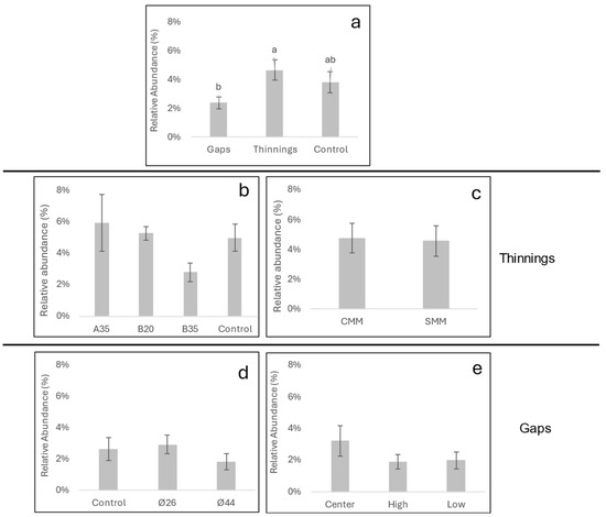 Comparison of relative abundance (OTUs) of soil plant pathogen fungi according to the following: (a) silvicultural treatments; (b) thinning intensity; (c) status of with (CMM) or without (SMM) coarse woody debris in thinning plots; (d) gap diameters; (e) gap sampling position. Bars indicate individual standard error. Different letters indicate significant differences at p < 0.05 according to Tukey’s, Duncan, and Kruskal-Wallis Tests, or n.s. for not significant. N = 6 and 18 (a), 3 and 6 (b), 9 (c), 3 and 9 (d), and 6 (e).