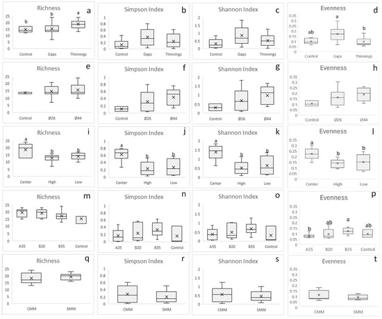 Box-plots of the richness, diversity index and evenness of total plant pathogen fungi sequences (OTUs) according to silvicultural treatments (thinning or gap; (a–d)), thinning intensity (A35, B35, B20; (m–p)), status of with (CMM) or without (SMM) coarse woody debris in thinning plots (q–t), gap diameters (Ø26 or Ø44; (e–h), and gap sampling position (high, center, low; (i–l)). Bars indicate individual standard error. Different letters indicate significant differences at p < 0.05 according to Tukey’s, Duncan, and Kruskal-Wallis tests. N = 6 and 18 (a–d), 3 and 9 (e–h), 6 (i–l), 3 and 6 (m–p), and 9 (q–t).