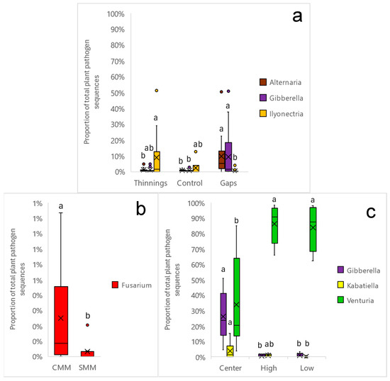 Box-plots of main Genus proportion of plant pathogenic fungi that have shown significant changes due to different silvicultural treatments (thinning or gap), status of with (CMM) or without (SMM) coarse woody debris in thinning plots, and gap sampling position (center, high, low). For each color, bars indicate individual standard error. Different letters indicate significant differences at p < 0.05 according to Tukey’s, Duncan, and Kruskal-Wallis tests. N = 6 and 18 (a), 9 (b), and 6 (c).