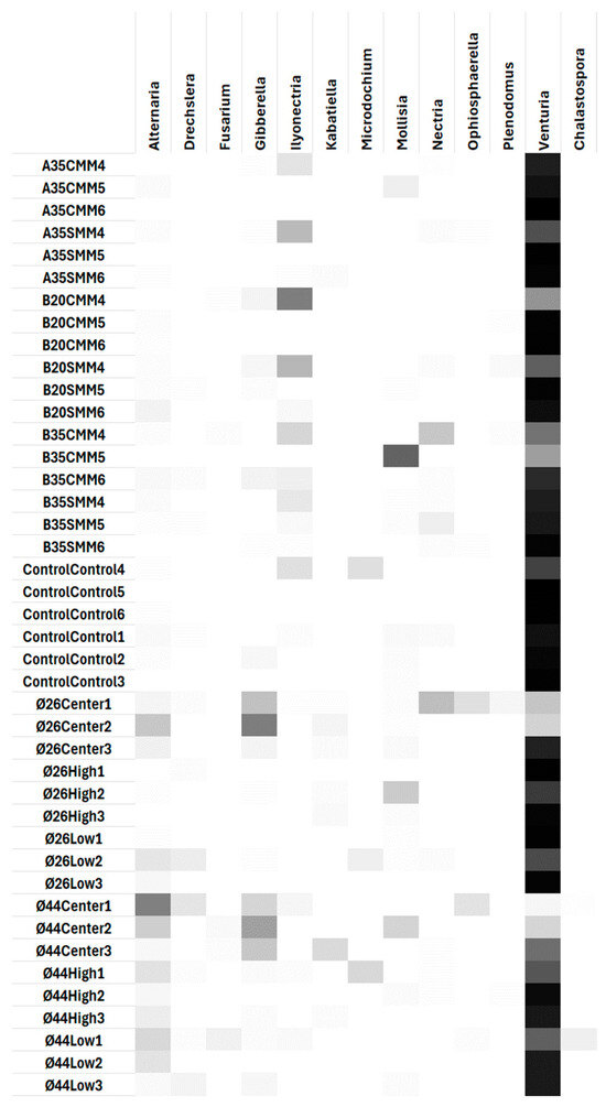 The proportions of plant pathogenic fungal sequences showed an almost absolute dominance of the Phylum Ascomycota, with a very scarce presence (<0.5%) of Basidiomycota (Figure S3a). Total predominance of the class Dothideomycota was observed, as was a presence in almost all sites of the class Sordariomycota, and sporadically of Leotiomycota (Figure S3b). At the order level (Figure S3c), a dominance of Venturiales was observed at all sites, except in the centers of the gaps, where its dominance was shared with the orders Pleosporales and Hypocreales. In contrast to the near-total dominance of Venturiales in the controls, the application of silvicultural treatments promoted the increase of Hypocreales in thinning plots and gap centers, as well as Pleosporales in the gaps. The genera (Figure 5) with representation greater than 0.5% were (in order from highest to lowest) as follows: Venturia (75%), Alternaria (6%), Gibberella (5%), Ilyonectria (4%), Mollisia (3%), Nectria, Microdochium, Ophiosphaerella, and Drechslera all with 1%, and finally Kabatiella, Herpotrichia, Fusarium, Chalastospora, Plenodomus, Collophora, Didymella, Phacidium, Ceratobasidium and Botrytis with a representation of <1%. Of all these, significant changes (p < 0.05) by site effect were only observed in the genera Venturia, Gibberella, Ilyonectria, Alternaria, Kabatiella and Fusarium (Figure 6). Globally (Figure 6a), the application of thinning treatment significantly (p < 0.05) promoted the increase of the genus Ilyonectria (9%) with respect to the gaps (<2%), although not with respect to the control (2%). The application of gap cuttings caused a significant (p < 0.05) increase of the genus Alternaria (10%), both with respect to the control and thinning treatments (<2%). The gaps also promoted significantly (p < 0.05) the increase of Gibberella (9%) with respect to the control (<2%), although not with respect to thinning. In the thinning plots (Figure 6b), the contribution of coarse woody debris significantly (p < 0.05) increased the presence of Fusarium (0.25%), although its representation was very low with respect to the rest of the main genera. In the gap plots (Figure 6c), the dominance of the genus Venturia was significantly reduced (p < 0.05) at the central points of the gaps (34%) relative to the extremes (84% and 86%); the representation of Gibberella (26%) was significantly increased relative to the high and low edges of the gap (<2%), as was Kabatiella (4%) relative to the low edge of the gap (<2%). A heat map shows the relative abundances of the main genera with respect to the total number of plant pathogenic fungi (Figure 7). Within the main genera found, only the following species were identified: Alternaria_brassicae, Alternaria_eichhorniae, Alternaria_eureka, Alternaria_hungarica, Alternaria_kulundii, Alternaria_leptinellae, Chalastospora_ellipsoidea, Fusarium_proliferatum, Gibberella_tricincta, Ilyonectria_macrodidyma, Ilyonectria_radicicola, Microdochium_phragmitis, Mollisia_cinerea, Nectria_ramulariae, Ophiosphaerella_herpotricha, and Plenodomus_biglobosus.